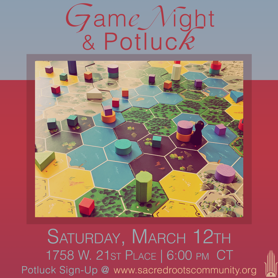 Join us for a game night and community potluck dinner on Sat. March 12th - 6:00 - 9:00 pm CT.