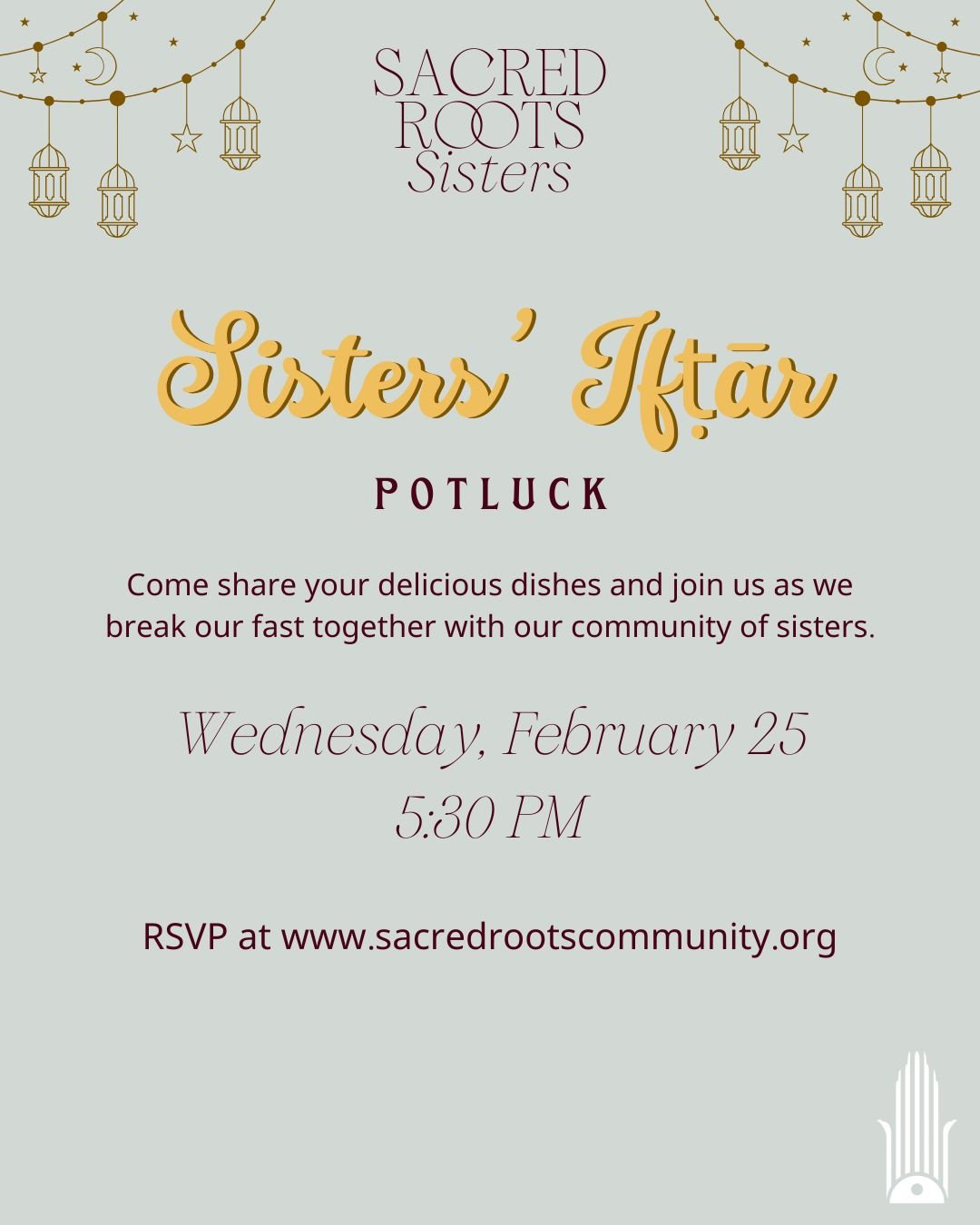 Join us for a Sisters' Ifṭār Potluck as we break our fast together with our community of sisters. Doors will open at 5:30 PM, followed by prayer and a shared potluck dinner, inshaAllah!
