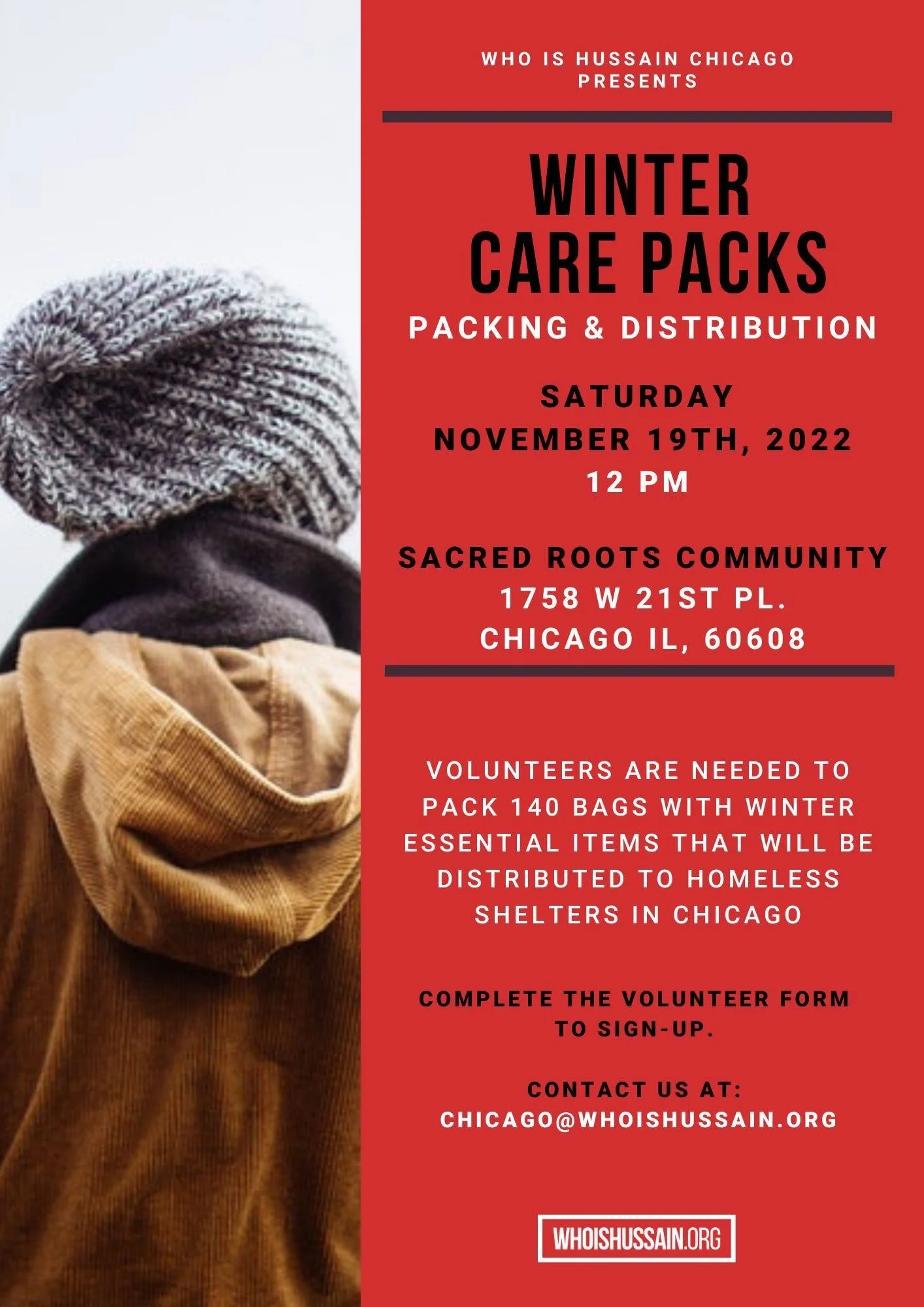 Join us at Sacred Roots this Saturday, November 19th for a volunteer opportunity with Who is Hussain. This is a wonderful opportunity for our community to get involved and help pack 140 winter weather bags to distribute to homeless shelters in the city. We hope to see you there!